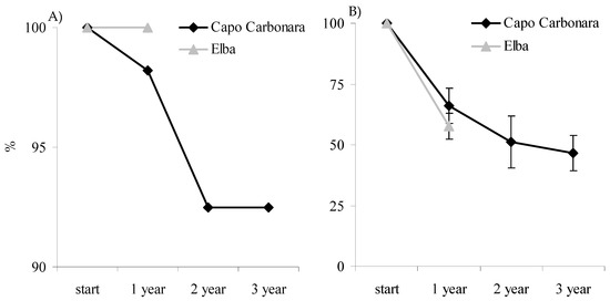 Percentage of plots remained in situ (A) and mean (±SE) survival of cuttings (B) in Capo Carbonara and Elba efforts every year to date.