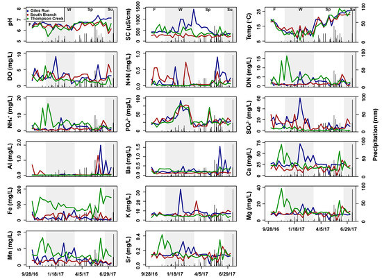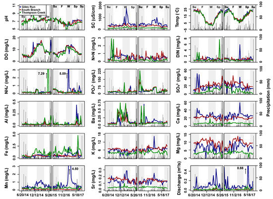 Time series plots of selected surface water variables for Giles Run (blue), South Branch (red), and Thompson Creek (green) over the two sampling periods (June 2014–July 2015 and May 2016–July 2017). Daily precipitation values are shown as black bars. The gap within each panel indicates the break between sampling periods. Alternating grey and white bars indicate the seasons: summer (Su), fall (F), winter (W), and spring (Sp). High outliers with values greater than the upper limit of the y axis are shown with an up arrow and the numerical value on the graph.