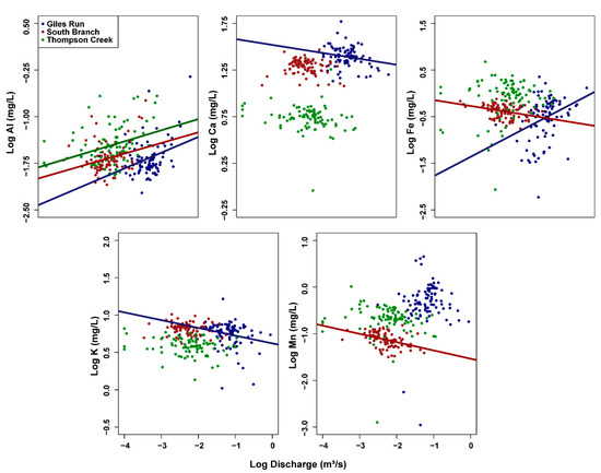 C–Q relationships support the idea that urban development in the GR watershed has changed the sources and transport of some dissolved constituents. While Fe in surface water had a significant positive C–Q relationship, indicating transport-limited behavior, both Ca and K had significant negative C–Q relationships, indicating source-limited behavior (Figure 4). These significant relationships occurred only in the most urbanized stream, GR, or the two most urbanized streams, GR and SB. Al had a significantly positive C–Q relationship not only in GR but in the other two streams as well. Al is mobilized by acid rain [35], which occurs in the Middle Atlantic region of the United States where Meadowood is located. Thus, the positive C–Q relationships for Al could be explained if acidic precipitation both increases stream discharge and mobilizes Al.