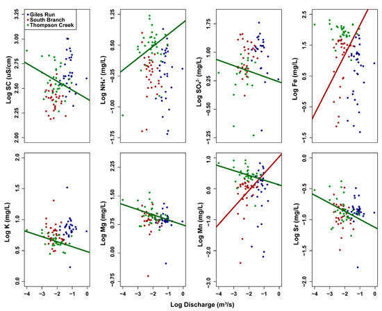 Log [concentration]—log [discharge] plots of selected surface water variables for Giles Run (blue), South Branch (red), and Thompson Creek (green). Plots are only shown when at least one stream had a C–Q relationship with a slope significantly different from 0. Regression lines of best fit included when the relationship was significant at p < 0.05. See Figure S1 for C–Q plots of all variables.