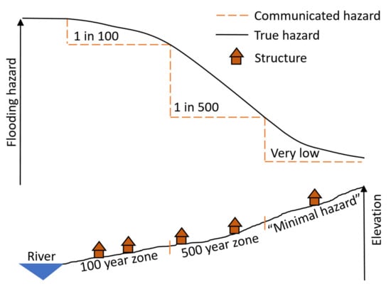 How one communicates flood probabilities can impact decision-making [8,9]. Flood probability maps are important sources of information about floods. The information communicated through these maps impacts decisions on where to build and whether to elevate structures to prevent flood damage and purchase flood insurance [9,10]. Flood maps typically consist of flood zones that bin continuous and spatially varying hazards into discrete flood zones [11,12,13,14,15]. The outer edge of a zone is the maximum extent of a flood with a designated probability (i. e. the 1 in 100-year flood), while the inner edge of a zone is the maximum extent of a smaller magnitude, higher probability flood. The choice to communicate via flood zones can introduce a low-bias in flood probabilities [11]. For example, the Federal Emergency Management Agency (FEMA) in the United States, publishes 1 in 100-year (1% annual chance) and 1 in 500 years (0.2% annual chance) flood zones [16]. The maximum extent of the 1% annual chance flood designates the boundary between the 1% and 0.2% flood zones. Thus, the 1% annual chance flood zone is essentially the > 1% annual chance flood zone, while the 0.2% annual chance flood zone is essentially the (1%, 0.2%) annual chance flood zone. Additionally, the “x” zones, also termed “area of minimal flood risk”, have a < 0.2% annual chance. This approach obscures the nature of continuous flooding probabilities with “in-out” flood zones [11]. The “in-out” approach can have serious consequences for flood hazard communication. [12] states that the 1 in 100-year flood zone “rapidly transformed in the community mind to a definition of flood free and flood-prone, with areas above the designated flood perceived to be flood-free—a misconception often reinforced by flood maps that shade only those portions that are subject to the designated flood”. Adopting a flood zone approach neglects to communicate key information [17] and can communicate biased hazards [11] (Figure 1).