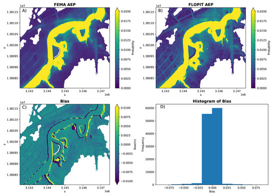 Comparison of the Annual Exceedance Probability (AEP) map provided by FEMA (A) as part of the Flood Risk Database with the AEP map generated by FLOPIT (B). The lower panels show the spatial distribution of bias (C) and the histogram of biases over all cells (D). FLOPIT’s interpolation method is log-linear. The map is for roughly 1.5 km reach of the Sims Bayou in Houston (TX). Longitude bounds are [−95.302, −95.281] and latitude bounds are [29.672, 29.675].