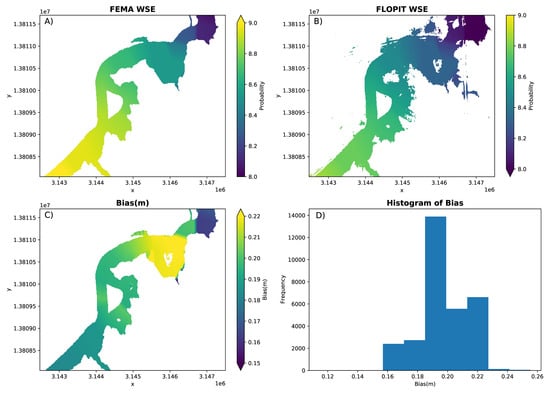 Comparison of the 100-year map provided by FEMA (A) as part of the Flood Risk Database with the 100-year water surface elevation map generated by FLOPIT (B). The lower panels show the spatial distribution of bias (C) and the histogram of biases over all cells (D). FLOPIT’s interpolation method is log-linear. The map is for roughly 1.5 km reach of the Sims Bayou in Houston (TX). Longitude bounds are [−95.302, −95.281] and latitude bounds are [29.672, 29.675].