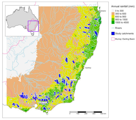 The study area and catchments used for this study are the same as those used by Saft et al. [3]. The catchments selected are largely free of contriving factors such as large reservoirs, substantial irrigation diversion or land use change. The catchments are located in close proximity to the great dividing range along the south-eastern coastline of the Australian mainland. These areas produce much of the runoff in south–eastern Australia including the Murray–Darling basin (MDB, Figure 1). Median annual runoff for the study catchments is 155 mm, while median annual precipitation is 870 mm and median annual potential evaporation is 1165 mm (Figure 2) In general, potential evaporation exceeds rainfall. Actual evapo-transpiration will vary more, since land-use across the study areas varies from forest in the more humid areas (generally greater than 800 mm p.a.), to pasture and annual crops, which dominate in the drier catchments. Seasonality of rainfall varies from north to south. In the south, rainfall is winter dominant, while in the north, summer rainfall is dominant.