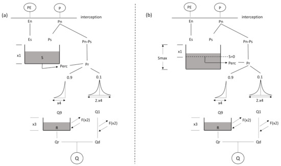 Model structure conceptual diagrams for (a) GR4J and (b) GR7J.