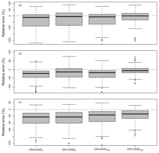 Prediction error of combinations of model and objective function at (a) 80% exceedance, (b) 50% exceedance and (c) 20% exceedance quantiles. Error is expressed as a percentage difference from the corresponding observed value. Boxes indicate 0.25 to 0.75 quantiles in data.