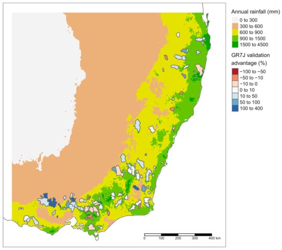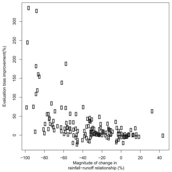 The magnitude of change in the rainfall–runoff relationship during extended drought was calculated for each catchment and expressed as a percentage change relative to the non-drought period. This was then compared to the improvement in evaluation (drought) bias for the GR7J/NSESeg model over the GR4J/NSEB to understand if the GR7J model structure is more effective in coping with non-stationarity in the rainfall–runoff relationship. This is illustrated in Figure 6, showing increased benefit of GR7J in terms of evaluation bias as the relative change in the rainfall–runoff becomes increasingly negative (drier). The superior fit of GR7J at low flows (Figure 5a), will result in superior fits in drought conditions as these will obviously be at higher exceedance flow values. Where the magnitude of change in the rainfall–runoff relationship is positive or close to zero, there appears to be little predictive benefit in the GR7J formulation. This is also evident spatially, where the benefit of the GR7J/NSESeg models are generally located in those catchments described by Saft et al. [3] as catchments with “change detected”, in reference to the effect of drought on rainfall–runoff relationships (Figure 7-visible as catchment polygons with blue fill).