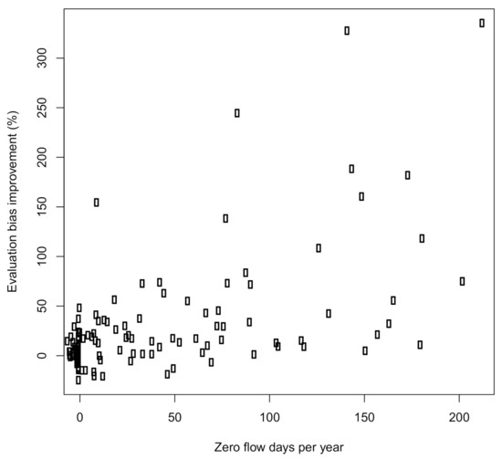 Increasing dryness and disconnection of groundwater and surface water can be indicated by the increasing frequency of no-flow days [32]. The predictive advantage to GR7J showed some influence in the number no flow days experienced within the evaluation period (Figure 8), and the authors consider this is a reasonable validation of the structural changes tested.