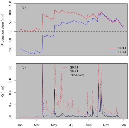 Production store levels (a) and runoff(b) for calibrated GR4J and GR7J models of catchment 222,007 in the year 1983.