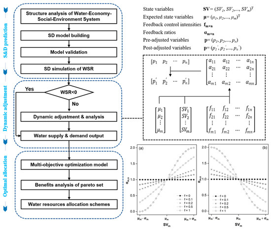 Feedback mechanisms provide an important theoretical basis for dynamic management and can be divided into positive and negative feedback according to the adjustment direction. Positive feedback makes the system locally unstable, whereas negative feedback makes the system oscillate or reach an equilibrium [25]. In water management, the difference between the real and ideal states of a system can be regarded as “the amount of action that needs to be taken” [14]. Dynamic feedback considers the system state and forms an adaptive management strategy which provides valuable insights to cope with the increasing uncertainty, complexity, and system interaction in water management [26].