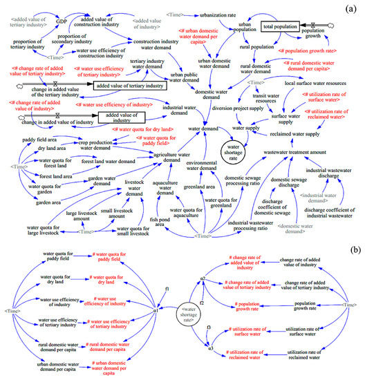 Water users are usually divided into agricultural, industrial, domestic, and environmental users and the efficiency of production-oriented water use in agriculture, industry, and the urban public is compatible with GDP growth and technological improvement. The agricultural, industrial and urban public water demand can be further calculated by the production scale (e.g., farmland irrigation area, amount of livestock, and fishpond area) or gross output value of agriculture and industry. The urban and rural domestic water demand are affected by two factors: the change in per capita water quota caused by water-saving equipment and water usage habits and the distribution of the urban and rural population caused by population growth and urbanization. The environmental water demand refers to urban green land irrigation water, determined by the green land area and water quota for green land. Detailed SD equations are provided in Table S1.