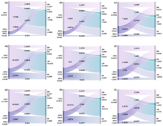 Sankey diagrams of optimal water resource allocation schemes under the scenarios of (a) High-2020, (b) High-2025, (c) High-2035, (d) Mid-2020, (e) Mid-2025, (f) Mid-2035, (g) Low-2020, (h) Low-2025, and (i) Low-2035. SWS, DWS, and RWS represent the optimized surface water, diversion water, and reclaimed water supply in the allocation schemes; DD, ED, AD, and ID represent the optimized domestic, environmental, agricultural, and industrial water demand in the allocation schemes. (Unit: 108 m3).