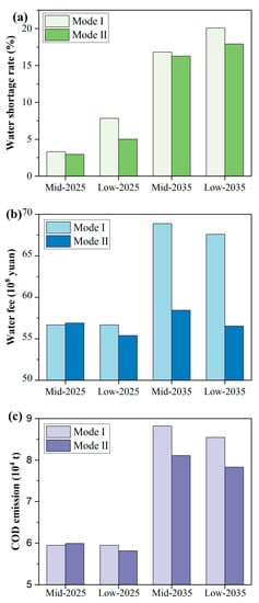 The traditional water resource allocation mode is “prediction + multi-objective optimization”, in which the predicted water supply and demand are taken to constraint multi-objective optimization [54]. Water scarcity indicates that the estimated population and economic development may overload water resources, and some necessary actions are needed [55]. The “prediction + dynamic adjustment + multi-objective optimization” model fully considers the compensatory actions by dynamic adjustment. In our case, water resources in Mid-2025, Low-2025, Mid-2035, Low-2035 were allocated by both the traditional “prediction + MOO” mode (Mode I) and the newly developed “prediction + dynamic control + multi-objective optimization” mode (Mode II). Comparing the individual benefits of optimal allocation schemes in the two modes, water shortage rate, water fee, and COD emission for schemes in Mode I are all higher than those in Model II (Figure 5). This proves that dynamic adjustment alleviates the pressure of water resources and expands the benefits of the allocation scheme.