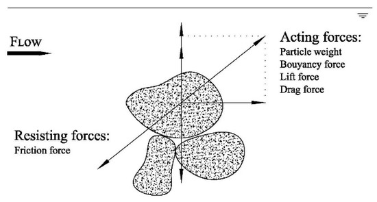 Bed load sediment transport is defined by Garcia [24] as the process through which streams, rivers, or bed material of artificial channels is transported. Additionally, Bagnold [25] defined the bed load transport as that which occurs in continuous contact with the bed surface and is driven just by gravity. On the other hand, Einstein [6,26] defined bedload transport as the transport that occurs by sliding, rolling, and jumping over the bed surface (saltation). These processes occur in a thin layer (two times sediment diameter approximately), called the bed load layer. Sediment will be transported when the acting boundary shear stress exceeds a critical value. Additionally, recent studies have shown that impulse may be a more appropriate parameter for determining particle motion threshold [27,28,29,30,31,32]. Generally, particle motion will begin when the acting forces, including sediment particle weight FW, buoyancy force FB, lift force FL, and drag force FD, overcome the resisting force, FR, as illustrated in Figure 1.