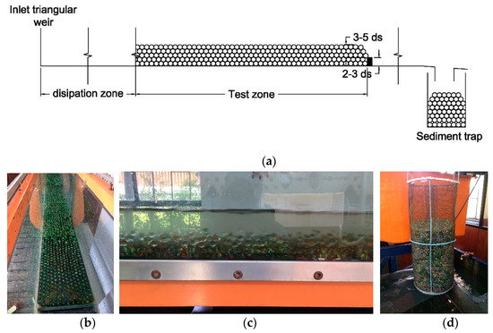 (a) Schematic of the simulation configuration, (b) test zone prepared for a simulation, (c) test zone during a simulation, and (d) sediment trap with the sediment collected in a simulation.