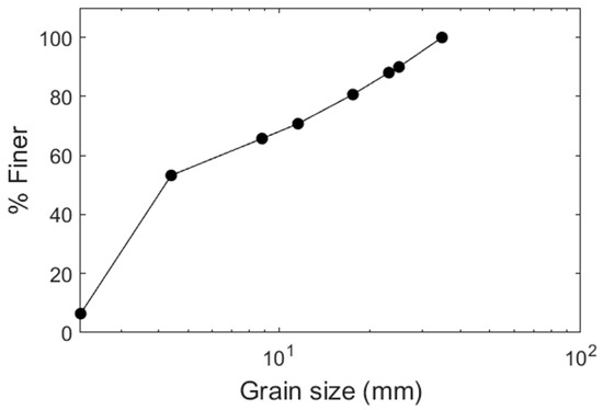 The experiment was carried out for four cases: A, B, C, and D, based on sediment characteristics. Case A corresponds to the experiments performed with spheres of a uniform diameter of 10 mm. Case B consisted of spheres of 15 mm and Case C of spheres of 25 mm. These sediment sizes were chosen to replicate the coarser range of sizes considered in previous studies. Case D was performed with a typical mountainous river grain size distribution that was built with the particle diameters used in the other cases. Figure 3 shows the grain size distribution for Case D. The median diameter d50 for this grain size distribution is 53.10 mm. In the present study d84 is considered as the characteristic diameter with d84 = 21.70 mm.