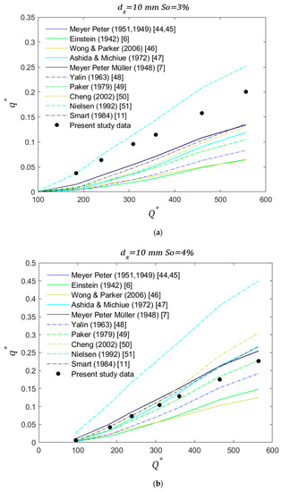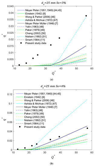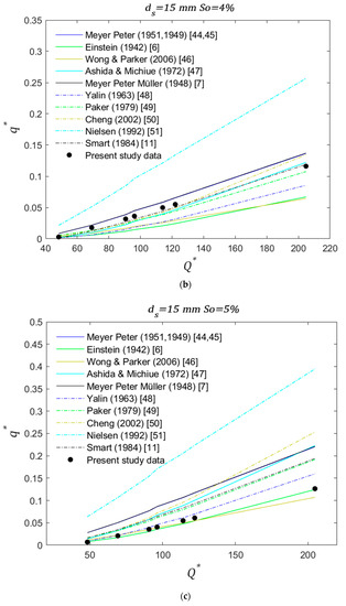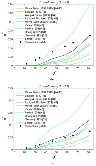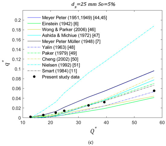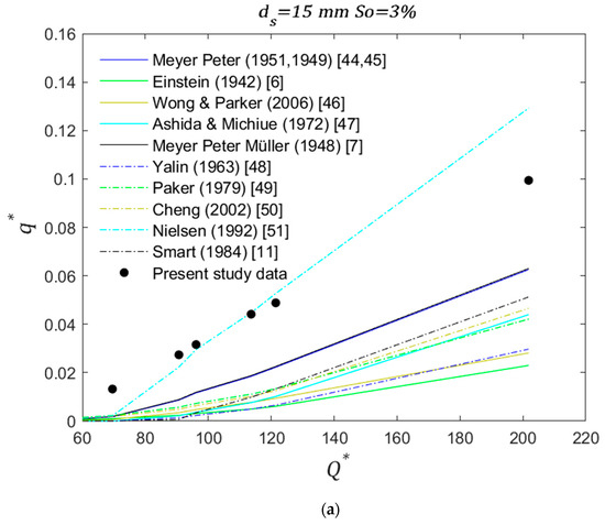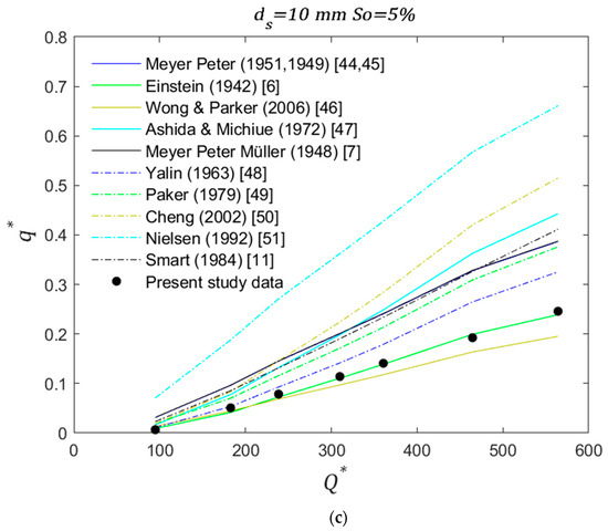The results of this experimental model were compared with equations obtained for gravel bed rivers in previous studies (presented in Table 1). The comparison between the different equations and Equation (12) states the following. For uniform diameters (10 mm, 15 mm and 25 mm) and for the smallest slopes analyzed (3% and 3.5%) the experimental transport rates show similarity to those obtained with the Nielsen simplified [51] equation (Figure 4a, Figure 5a and Figure 6a). However, as diameter size increases this similarity starts to decrease. Additionally, with a few exceptions, the laboratory rates tend to be higher than all the values from the equations in the literature. As slope increases to intermediate (4% and 4.5%), the experimental rates start to decrease with respect to the calculated rates and became similar to [11,47,49] for ds = 10 mm and 15 mm (Figure 4b and Figure 5b, respectively), and to [7,44,45] for ds = 25 mm (Figure 6b). For the highest slope (5%) experimental rates are similar to [6,46] for ds = 10 mm and 15 mm (Figure 4c and Figure 5c, respectively), [48] for ds = 15 mm (Figure 5c), and [11,48,49] for ds = 25 mm (Figure 6c).