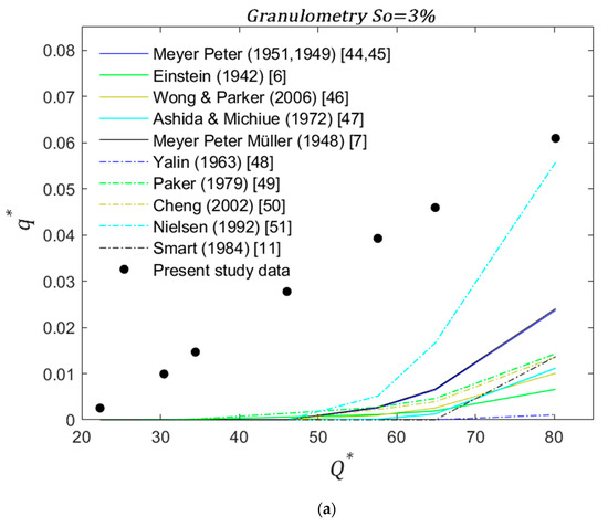 For grain size distribution in Case D, the equations overestimate the measured rates for slopes of 3% (Figure 7a). For intermediate slopes (4%), slight similarities are reported with [7,44,45,51] (Figure 7b). For the highest slopes (5%) experimental rates are similar to [11,47,49,50] (Figure 7c). As observed from the comparison, some similarities are observed between previous models and Equation (12). Since most of the models do not report a range of slopes, special attention is placed on the model in [11] given that this model was developed considering high slopes (up to 20%). The experimental transport rates show considerable agreement with this model’s rates, especially for slopes of 4% and 5%. Since the model has been demonstrated to perform well for steep slopes [20], it may be concluded that the experimental model developed here could be used to estimate bedload transport rates in streams with slopes of up to 5%.