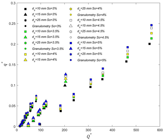 Considering just the results of the present study, for mild slopes the difference between the bedload transport rates obtained for the four cases (A, B, C and D) is higher than for the high slopes. With a slope of 5% the difference between highest and lowest transport rate (for the same discharge) has a value of 12% approximately. For 3% the difference is 35%, indicating that as slope increases particle diameter distribution decreases its impact on transport rate. Additionally, as can be observed in Figure 8 that presents the transport rates obtained from the experiments, dimensionless transport rates for Case C (ds = 25 mm) and Case D (Granulometry) have similar behavior. Since characteristic diameter d84 (20.8 mm) was used to put variables in dimensionless form for Case D, this supports the definition of d84 as the characteristic diameter for sediment mixtures [54,55,56]. Even though the grain size distribution is built from the same uniform diameters, this fact could lead to the idea that for steep slopes the size distribution may have less influence on the transport process, and can be represented with a single particle size [54].