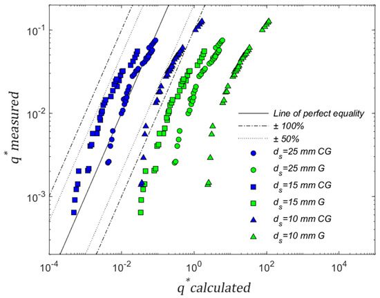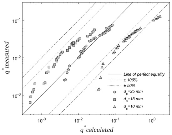 Considering the level of agreement between bedload transport rates’ formulae and field and laboratory measurements reported in several studies that can reach differences as high as eight orders of magnitudes [16], predictions within an order of magnitude could be considered satisfactory. The range 0.1 < q*calculated/q*measured <10 represents the range within an order of accuracy, and it has been defined as the reference to consider bedload predictions valid [55,57,58]. Even though bedload sediment transport has been studied for several decades, higher accuracy has not been possible to obtain due to factors such as the highly fluctuating nature of sediment transport, together with the fact that its predictions are based on average flow conditions [3]. To determine the prediction capacity of Equation (12), predictions are compared with the measured transport rates obtained for Case A, Case B, and Case C considering that this data is independent from the data used to obtain Equation (12) (Case D). This set of data had to be selected due to a lack of data with the level of detail required for calculations of the transport rates with Equation (12). In Figure 10. measured and calculated transport rates are presented. The line of perfect equality and the lines defining the range 0.1 < q*calculated/q*measured<10 are also presented. As observed, eight points of the 105 considered do not meet this validation criteria. This represents that 92% of the data fall within the range of an order of magnitude. Since verified predictions correspond to uniform shape material and size and the model was obtained with a size granulometric distribution and uniform shape, we may assume that this methodology could be verified for laboratory simplified environments (uniform sediment size and shape). Therefore, it can be used to reduce the level of simplification and thus obtain a model that can be applicable to field conditions. The consideration more general conditions, especially for sediment such as that with larger, almost immobile, sediment particles and natural forms, can lead to the improvement of the prediction capacity of a model obtained based on the methodology applied here.