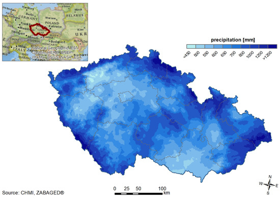 Spatial distribution of average annual precipitation in the Czech Republic for the reference period 1981–2010.