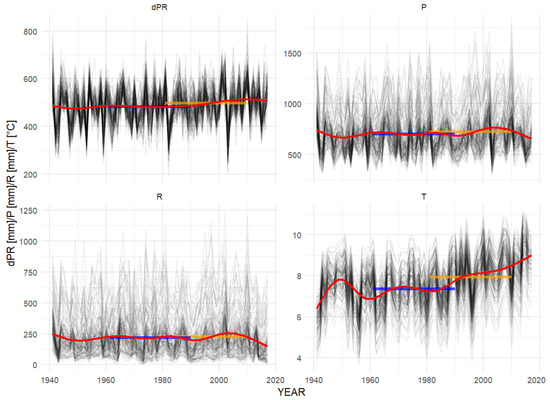 The difference between precipitation totals and runoff (dPR), precipitation totals (P), runoff heights (R), and air temperature (T). Red: local polynomial regression; blue: average for 1961–1990; orange: average for 1981–2010; grey: yearly observation. The data gathered from 334 water gauging stations and 133 meteorological stations.