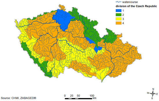 From the available data, areas with different runoff regime (see Table 2 and Figure 5) were defined according to parameter , which indicates the ratio between the average daily flow with an exceedance probability 99% and the value (long-term average flow 1981–2010).