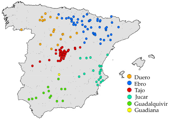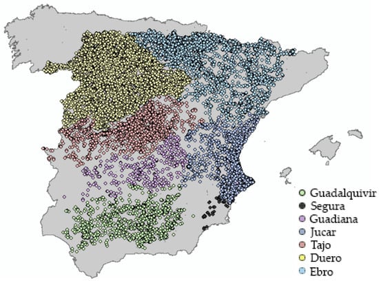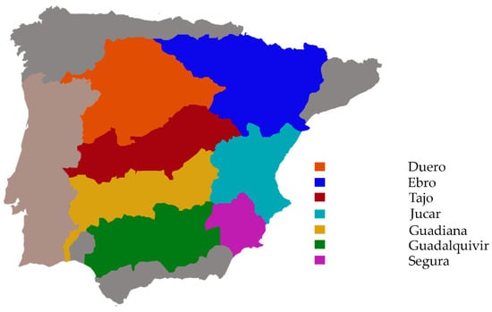The study area was focused on the main seven river basins in Spain (Figure 1) for which the information about the water discharge licenses was publicly available. The study covered a total area of 394,571 km2, representing 78% of the country total area and 80% of the peninsular Spanish area. The sum of the annual discharge volumes reaches around 4976 Hm3, which correspond to 16,778 different discharge licenses. Most discharge licenses could be classified into three general groups, depending on the provenance of the effluent, corresponding to WWTPs, industry and fish farms. Within industry, some further subgroups were then distinguished, which will be specified later. These river basins included Duero, Ebro, Tajo, Jucar, Guadiana, Guadalquivir and Segura rivers, for which the total area, population, total authorized discharge volume and number of licenses are summarized in Table 1.