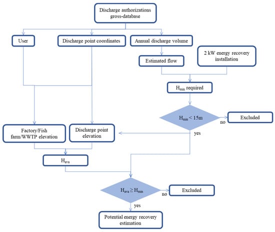 Schematic representation of the process stablished to determine the energy recovery potential with MHP from discharge licenses data.