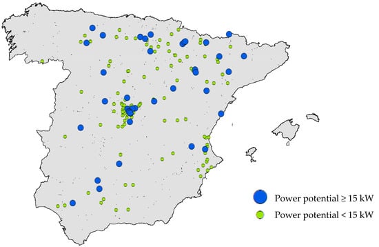 Once the total MHP energy generation potential in Spain was assessed, the possible variation in results when considering a shorter operating time of the facilities was evaluated. Thus, the assessment of the possible sites with MHP potential under a 12 h-day operating pattern was carried out for the total of discharge licenses included in the initial database. The new criteria doubled the power to be installed in those sites that already showed any MHP potential in the first assessment, as the flow rate is doubled. This higher power, combined with the 50% reduction in the operating time, resulted in the annual potential for energy generation remaining unchanged. However, the 12-h working assumption included 348 new discharge licenses to be analysed, increasing the initial test set by 74%. From those, only 21 sites showed any potential for MHP higher than 2 kW, as the rest did not have the required difference in height. The WWTPs and industries related with the energy production represented 14 and one of these sites, respectively. In both cases, a 12-h operating regime was considered less realistic than 24-h working time, so finally, only six new sites (five from the agri-food sector and one from the construction sector) were included in the final calculations. The inclusion of these six industries supposed an increase of 22 kW of power, equal to an annual energy generation potential of 98 MWh, which represented only a 0.3% increase.