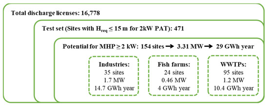 After the Hmin requirements calculations, only the set of cases whose Hmin was equal or lower than 15 m was selected to look for the sites with energy recovery potential for MHP. This limit value was set as a conservative threshold after it was found that very few cases met the requirement of having a difference in height between the wastewater treatment works and the discharge point higher than 10–12 m.