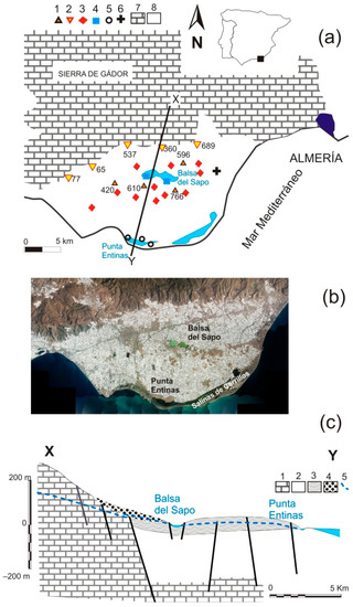 The main aquifer materials in CD are dolomites and dolomitic limestones from the Triassic age, with a thickness that can surpass 1000 m and outcroppings that form the Sierra de Gádor. These materials progressively deepen below Neogene and Quaternary deposits in the CD. The impermeable Neogene materials confine the deep carbonate aquifer and separate it from a detritic shallow aquifer (Figure 1). The waters of deep carbonate aquifer are Mg-Ca-HCO3 type with low salinity and conductivity of less than 1000 µS·cm−1. In the shallow aquifer they are Mg-Na-Cl type with conductivity in a range of 1500–4500 µS·cm−1 [24]. This system represents the main source of water supply for the most productive fruit and vegetable sector in Europe. Managing water resources involves diversification of water resources, fostering the use of desalinated water as well as the reuse of wastewater [20,21]. The Sierra de Gádor-Campo de Dalías system shows the complexity of managing water resources in semi-arid environments, where groundwater extraction must be suitable for groundwater management in agricultural areas [22], taking into account the importance of water management at basin scale [23]. These two points are especially important in areas such as the CD with major land use changes and considerable groundwater exploitation that has radically transformed the landscape [21]. Groundwater exploitation has increased rapidly from the 1960s to the present. Initially, extractions were concentrated in the shallower aquifer mainly due to its easy access. In the 1990s, extractions from the shallow aquifer decreased, due to the salinization of its waters as a result of irrigation return flows and soil salinization [24]. This led to the search for other water resources and the deep carbonated aquifer began to be heavily exploited through deep drilling, reaching extraction volumes of 120 × 106 m3/year [20] as a result of its good water quality. The development of this process brought about the formation and evolution of the Balsa del Sapo inland wetland [25]. The Punta Entinas wetland is located on the coastal edge of CD, separated from the sea by a sand bar and dunes. The outcropping geological materials in its interior setting correspond to a powerful series of loams covered by sandy loams, sands, and calcarenites of the Pliocene age above which there are four levels of Tyrrhenian marine deposits [26].
