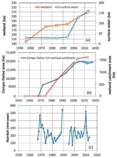 (a) Evolution of the total area (hectares) occupied by the wetland including all mapped environments and the area occupied by surface water. (b) Evolution of the land area occupied by greenhouses throughout the Campo de Dalías (CD) and in the coastal wetland catchment area. (c) Annual rainfall, La Mojonera station.