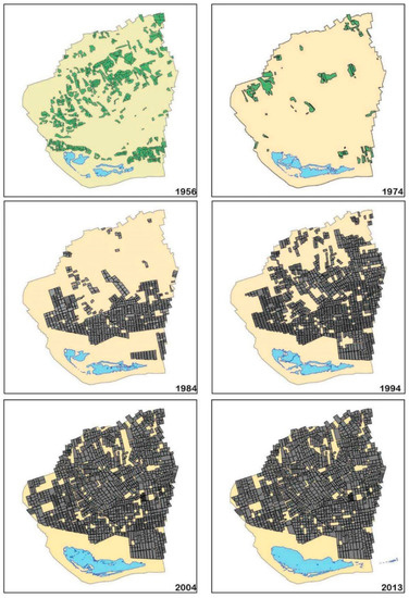 The image processing was performed over the hydrological basin slope down to the wetland of Punta Entinas using the digital model of the land obtained from Andalusia Digital Orthophotography, from the year 2001–2002 with a resolution of 10 m. The interpretation was done manually, analyzing the images from 1956 and 1974 with a stereoscope. The interpretation of the aerial images is done in a non-automatic way, manually using GIS (Arc GIS) (ESRI, Redlands, CA, USA). A difference is drawn between traditional crops (essentially rainfed cereals and some tomato crops) and greenhouse crops for the agricultural plots. For the analysis of the images in the surroundings closest to the wetland, the following areas were identified: surface water (flooded areas at the time of photography, including those with clear evidence of flooding), salt marsh (high density Quenopodiaceae formations), floodable salt marsh (seasonally flooded), salt marsh with Sabinar-Lentiscar (ecotone areas between the dunes with arborescent vegetation of Juniperus phoenicea subsp. turbinata and Pistacia lentiscus and salt marsh, that form a dense patch with plants of bush structure indicating that they are not found in seasonally flooded areas), reed-beds (based on changes between the height, density and texture of the vegetation) and small islands (small isolated areas on which salt marsh vegetation is found, sometimes dotted around in the form of reeds and halophytes). Their presence links to the growth of the surface water and the flooding of new spaces.