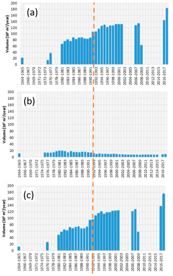 Evolution of groundwater exploitation for (a) the whole area of Campo de Dalías, (b) shallow aquifers, and (c) deep aquifers (in blank: there is no data). The vertical line corresponds to the date that separates the two periods defined, according to the evolution of surface water pumpings.