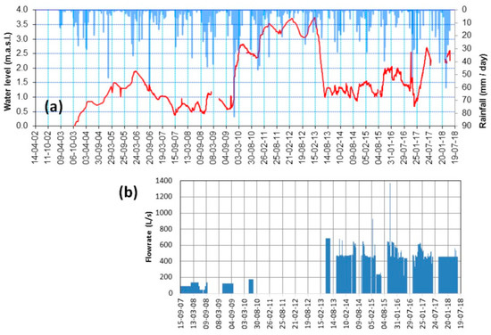 (a) Evolution of surface water elevation (wetland Balsa del Sapo) and rainfall (La Mojonera) in the period 2003–2016; (b) average daily pumped flow. Location of the rainfall station in Figure 1a.