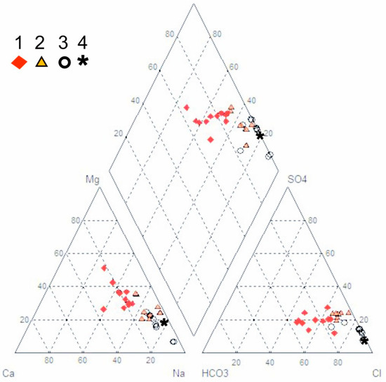 Piper diagram of hydrochemical data. 1: shallow aquifer; 2: Balsa del Sapo; 3: Punta Entinas; 4: sea water. Point location in Figure 1a. Balsa del Sapo data from [25].