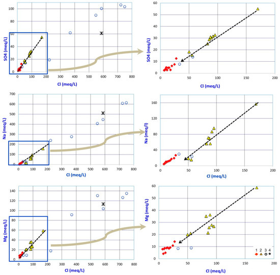 Ionic ratios in surface water of coastal and inland wetlands and groundwater of shallow aquifer. 1: shallow aquifer. 2: Balsa del Sapo. 3: Punta Entinas. 4: Sea water. Point location in Figure 1a. The arrow in the graphs to the right shows the time evolution of surface water in the Balsa del Sapo wetland. Balsa del Sapo data from [25].