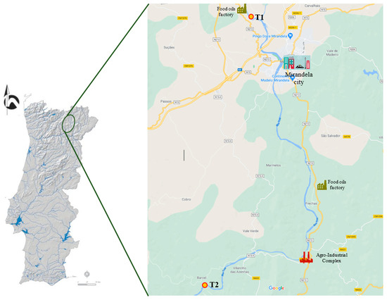 Map of the study area and the location of the two sampling sites (T1 and T2) in the Tua River basin. The water samples were collected in two different seasons (summer and autumn).