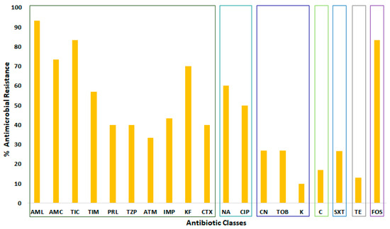 Overall, the antibiotic resistance for aeromonads was high and was as follows: fosfomycin (FOS) 83.33% (25/30); nalidixic acid (NA) 60% (18/30); cefotaxime (CTX) 40% (12/30); gentamicin (CN) 26.67% (8/30); tobramycin (TOB) 26.67% (8/30); cotrimoxazole (SXT) 26.67% (8/30); chloramphenicol (C) 16.67% (5/30); and tetracycline (TE) 13.33% (4/30). It is interesting to note that the highest incidence of resistance of Aeromonas spp. isolates was to β-lactam antibiotics, namely to amoxicillin (AML) (93.33%) and to ticarcillin (TIC) (83.33%) (Figure 2). These findings are consistent with those of a previous study which demonstrated that Aeromonas spp. are endogenously resistant to β-lactams, therefore representing a potential risk to public health. β-lactam antibiotics are the most broadly used antibiotics worldwide since they have a broad spectrum of antibacterial activity [28,38,39,40,41,42]. This resistance occurs due to the presence of an unstable β-lactam ring in the structure of β-lactam antibiotics, which are susceptible to bacterial hydrolysis by chromosomal β-lactamases produced by Aeromonas that are easily eliminated [43].