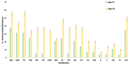 Percentage of antimicrobial-resistant bacteria along the river: Site T1 (green) and Site T2 (yellow). Values were expressed as the mean of resistant Aeromonas spp. ± standard deviation, for the same antimicrobial. * and ** indicate significant differences between different locations (sites T1 and T2) within the same antimicrobial (ANOVA followed by Tukey’s test at p < 0.05 and p < 0.01, respectively). Antibiotic abbreviations: AML—amoxicillin; AMC—amoxicillin/clavulanic acid; TIC—ticarcillin; TIM—ticarcillin/clavulanic acid; PRL—piperacillin; TZP—piperacillin/tazobactam; ATM—aztreonam; IPM—imipenem; KF—cephalothin; CTX—cefotaxime; NA—nalidixic acid; CIP—ciprofloxacin; CN—gentamicin; TOB—tobramycin; K—kanamycin; C—chloramphenicol; SXT—trimethoprim/sulfamethoxazole; TET—tetracycline; and FOS—fosfomycin.