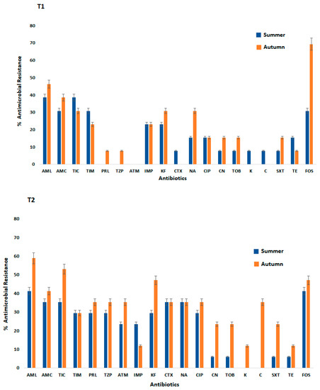 Percentage of antimicrobial-resistant bacteria for each sampling site (T1 and T2) by seasons (summer—blue color vs. autumn—orange color). Values were expressed as ths mean of resistant Aeromonas spp. ± standard deviation, for the same antimicrobial. No lettering indicates non-significant differences at a 95% confidence level. Antibiotic abbreviations: AML—amoxicillin; AMC—amoxicillin/clavulanic acid; TIC—ticarcillin; TIM—ticarcillin/clavulanic acid; PRL—piperacillin; TZP—piperacillin/tazobactam; ATM—aztreonam; IPM—imipenem; KF—cephalothin; CTX—cefotaxime; NA—nalidixic acid; CIP—ciprofloxacin; CN—gentamicin; TOB—tobramycin; K—kanamycin; C—chloramphenicol; SXT—trimethoprim/sulfamethoxazole; TET—tetracycline; and FOS—fosfomycin.