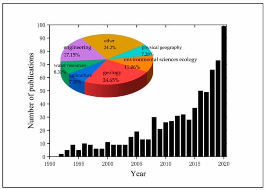 Number of annual publication on unfrozen water in frozen soils (UWFS) from January 1992 to December 2020 of Web of Science Core Collection. The pie chart is the top six major research areas.