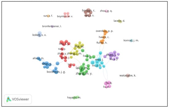 The co-authorship network visualization map of 95 authors out of 2023 authors with more than five publications as produced by VOSviewer. The size of circle and font in the map depends on the degree of nodes, the strength of links, and the amount of citations. The color of a circle represents the cluster to which it belongs and different clusters are represented by different colors.
