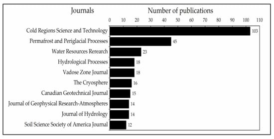 There are 217 journals that published 719 publications on UWFS, with the top 10 journals accounting for 38.66% of the total publications (278, Figure 4). The most utilized journal is Cold Regions Science and Technology that published 103 papers on UWFS, followed by Permafrost and Periglacial Processes and Water Resources Research (Figure 4). The study of frozen soil and unfrozen water is of great significance in engineering [68,69], mechanics [70,71], and water resources or hydrology [72,73] in cold regions. It is understandable that these three journals carried a significantly higher volume of such studies compared to other journals. It should also be noted that there are two open-access journals, The Cryosphere that was launched in 2007 focusing on all aspects of frozen soils and ground on Earth and on other planetary bodies, while the Vadose Zone Journal that was published under the Open Access model since late 2017 has special sections focusing on cold region hydrology and frozen soil processes. These journals are expected to play an increasingly significant role in promoting frozen soil studies.