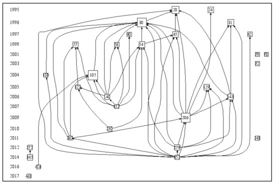 - Lucio-Arias, D.; Leydesdorff, L. Main-path analysis and path-dependent transitions in HistCite™-based historiograms. J. Assoc. Inf. Sci. Technol. 2008, 59, 1948–1962. [Google Scholar] [CrossRef]