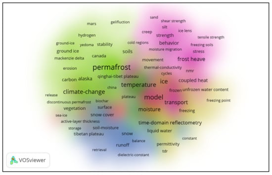 Figure 6 is a cluster density visualization map of keywords in the literature on unfrozen soil water research using VOSviewer 1.6.15. There are 114 keywords that occur more than 10 times. They are grouped into six clusters by VOSviewer that qualitatively show six research fields. For instance, the green-colored cluster mainly focuses on “permafrost” in “Qinghai-Tibet Plateau”, “Alaska”, “Canada”, “Mackenzie Delta” under “climate change”. The blue-colored cluster is related to “snow cover” or “snow” and their effects on “soil moisture” (as well as its measurement as indicated by “dielectric constant”), and “runoff”. While the pink-colored cluster is characterized with soil mechanics and numerical modeling as indicated by keywords of “frost heave”, “creep”, “movement”, “shear strength”, “tensile strength”, “strength”, and “model”.