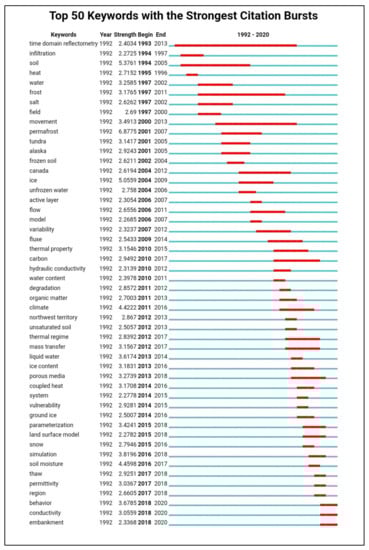 The strongest citation bursts map showed the top 50 keywords in frozen soil from 1992 to 2020 by CiteSpace. Blue indicates the time when keywords appear, and red indicates the time when keywords burst.