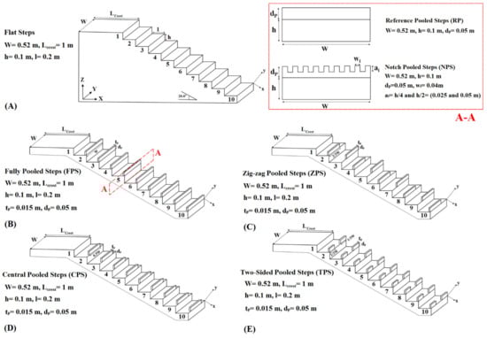 Sketch of stepped spillway configurations with flat, pooled, and notch pooled steps: (A) flat steps; (B) FPS; (C) ZPS; (D) CPS; (E) TPS.
