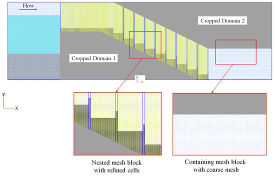AutoCAD® software was used to build the geometries of the models through an sterolithography (STL) file. Two mesh blocks were used: a containing mesh block was created for the entire spatial domain and a nested block was built, with refined cells for the area of interest where the stepped spillway is located. The areas where flow was not expected were cropped in the meshing process in order to increase the efficiency of the simulation without affecting the results, as shown in Figure 3. This technique (the nested mesh block technique) was adopted from previous studies by Choufu et al. [48] and Pourshahbaz et al. [49]. Best practice is to have fixed points aligning the mesh boxes and aspect ratios of no greater than 2.